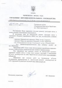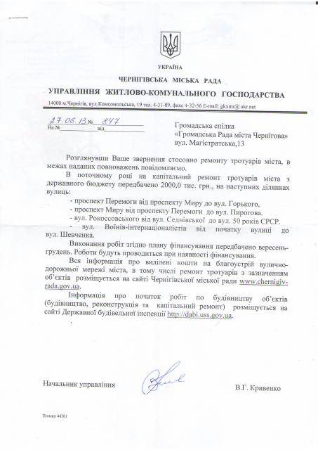 Громадська спілка «Громадська рада міста Чернігова» отримала відповідь на резолюцію, яку Чернігівському міському голові Олександру Соколову подали учасниці акції «Краса врятує світ і тротуари міста» 30 травня.
