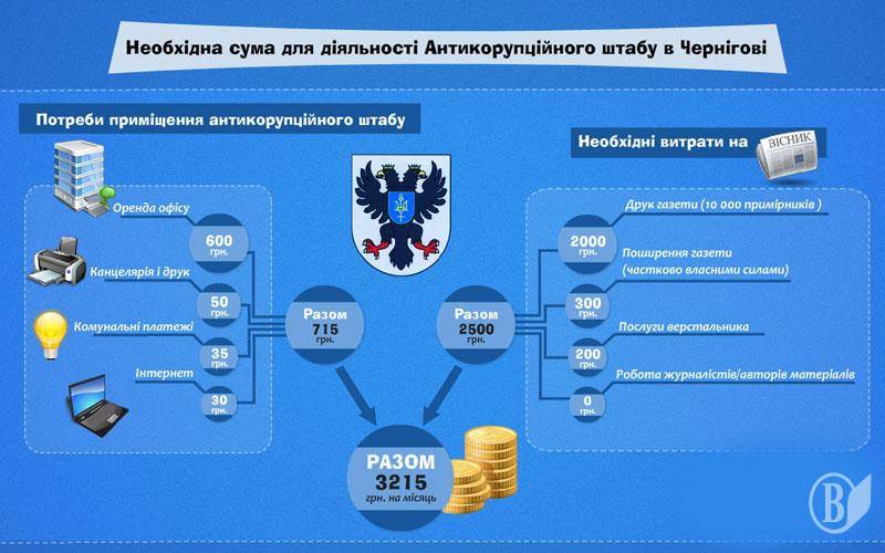 Необхідна сума для діяльності Антикорупційного штабу в Чернігові – 3215 грн. на місяць.