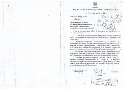 Сьогодні є в наявності цікавий документ, це розпорядження голови Обласної Державної Адміністрації за номером 219 від 3 травня 2011 року “Про упорядкування обліку пам’ятників монументального мистецтва і топонімічних назв у населених пунктах області”.