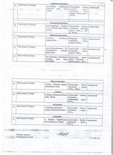 Згідно з цього документу, Ніжинська скульптура Леніна знята з державного обліку і не є чимось історично, або духовно цінним. Тепер цінність цієї скульптури представляє лише кольоровий метал, з якого зроблений вождь. Сама скульптура є інвентарем комунального управління ВУЖКХ і підлягає зняттю з реєстру і подальшому демонтажу.