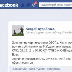 І далі Андрій Кудабеков повідомляє «Звонил и передавал смс: Ручко Евгений , оперполномоченный по особо важным делам УБОП, Чернигов».