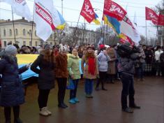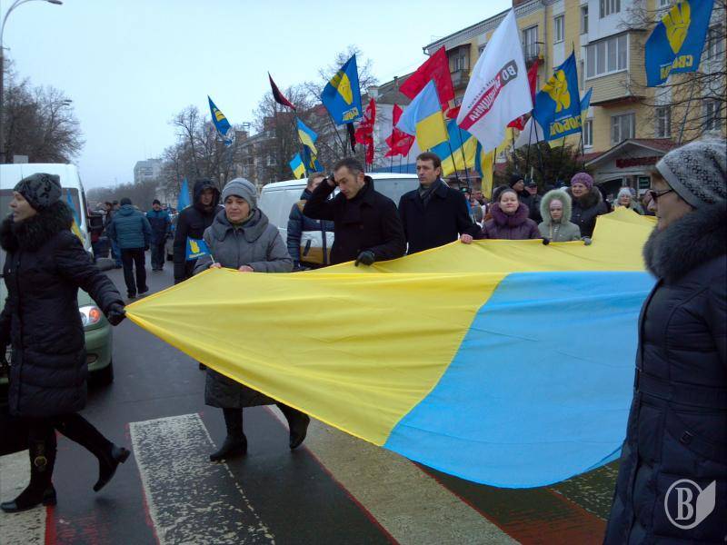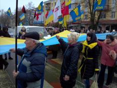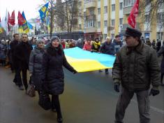 Прилучали пройшли ходою з 11:30 вулицею Київською до пам'ятника Тарасові Шевченку. Вони несли величезне полотнище державного прапора України і скандували "Прилуки - вставай!".