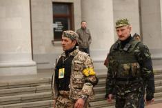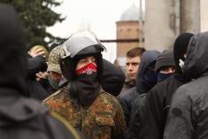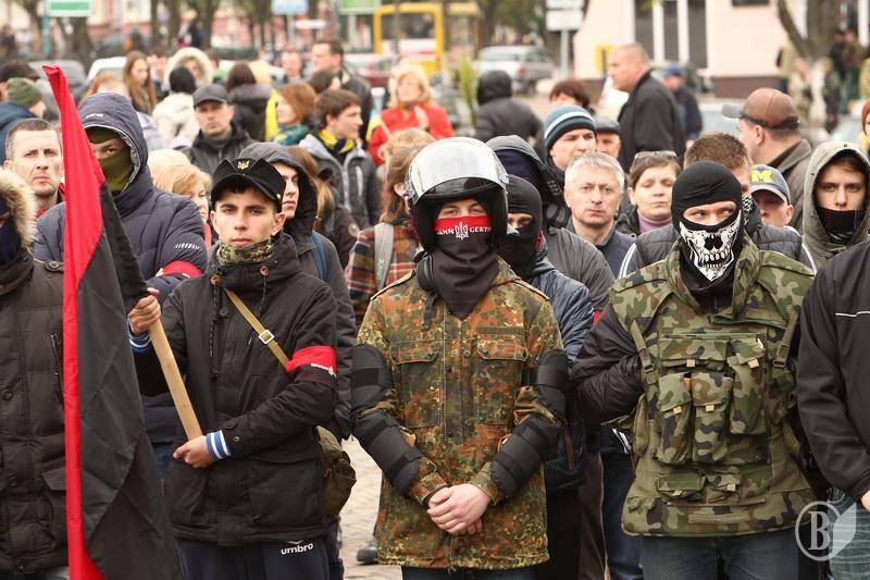 Поряд підтримували промовців молоді люди в масках, балаклавах і із прапорами й нарукавними пов'язками партії "Правий сектор".