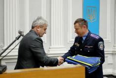 Он вручил командиру батальона Национальной гвардии Украины Александру Рыбаку государственные флаги Украины.
