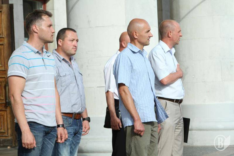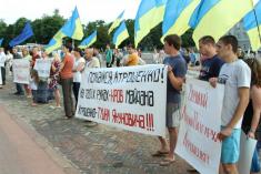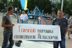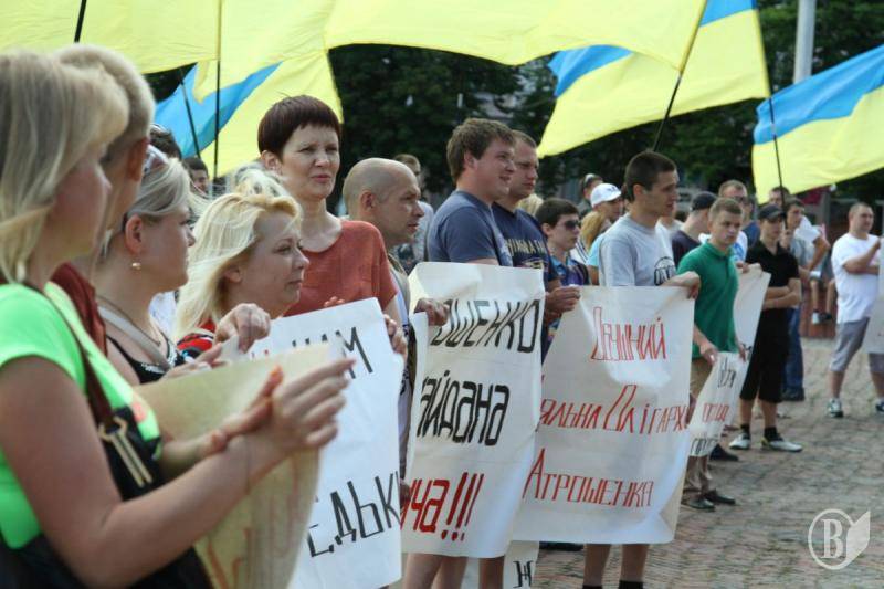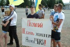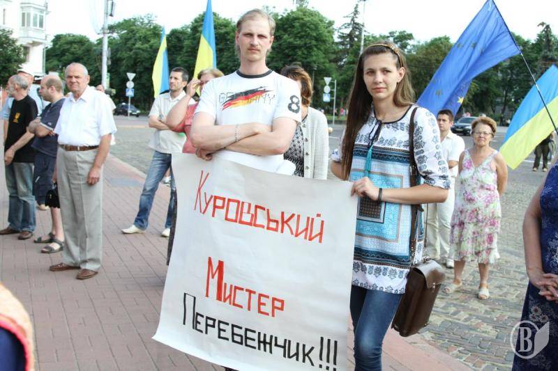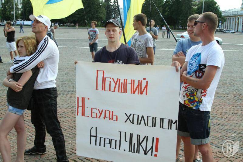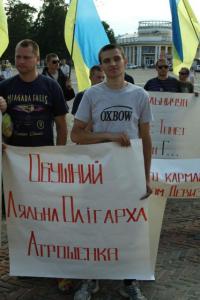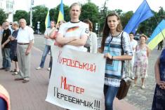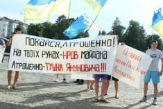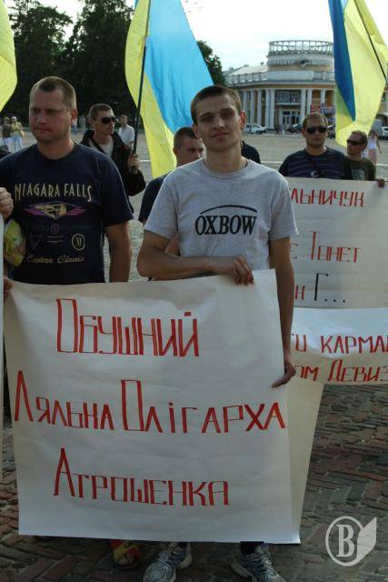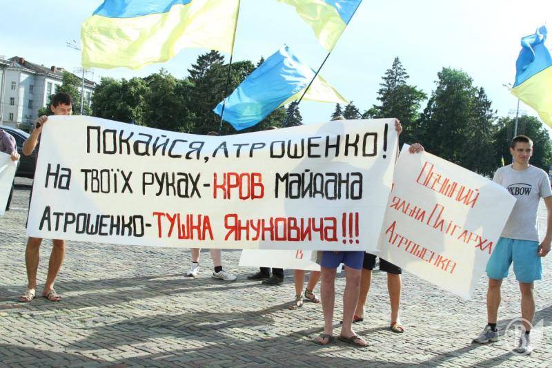 Учасники мітингу тримали рукописні транспаранти "Атрошенко! На тобі - кров Небесної Сотні!", "Мельничук! Подорожуй за" Леніним "," Соколов, Іди Вже ".