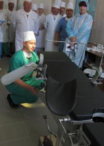 Тут таки він і демонструє: стіл повертається, нахиляється і складається у найрізноманітніших комбінаціях. Анатолій Отрошко каже: «Тут можна всі операції робити: і нейрохірургічні і травматологічні. Стіл цей – багатофункціональний. Ми коли його підбирали, то так, щоб і проктологічні і гінекологічні».