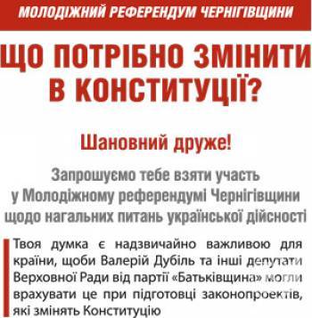 - Повні результати Молодіжного референдуму Чернігівщини ми передамо Валерію Дубілю, іншим народним депутатам з "Батьківщини" або парламентської коаліції. А вони, у свою чергу, підготують на основі цього поправки, які пізніше внесуть на обоговоренння робочої групи з реформування нашого Основного Закону.