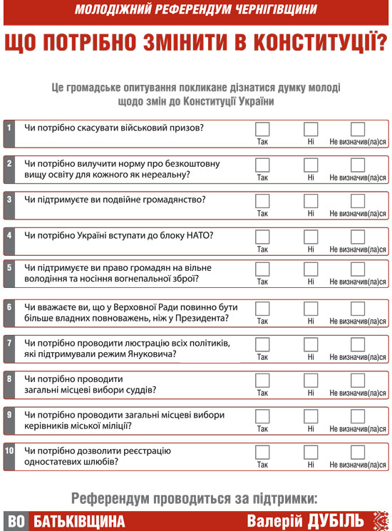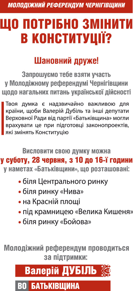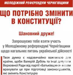 - Повні результати Молодіжного референдуму Чернігівщини ми передамо Валерію Дубілю, іншим народним депутатам з "Батьківщини" або парламентської коаліції. А вони, у свою чергу, підготують на основі цього поправки, які пізніше внесуть на обоговоренння робочої групи з реформування нашого Основного Закону.
