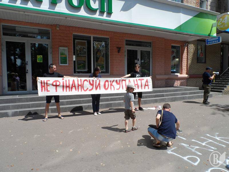 Чернігівці побачили опівдні ігрову сценку у центрі міста поруч із зупинкою транспорту «Україна», як патріотичні сили протестували проти російських банків, через які, на їх думку , іде фінансування самопроголошений республік на Донбасі.