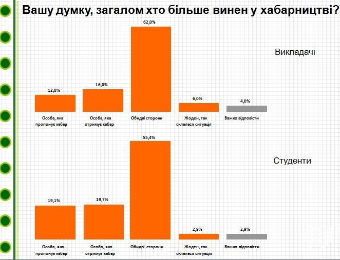 Самое интересное то, что среди 500 опрашиваемых почти одинаковое количество и студентов, и преподавателей считает, что во взяточничестве обе стороны виноваты одинаково.