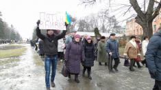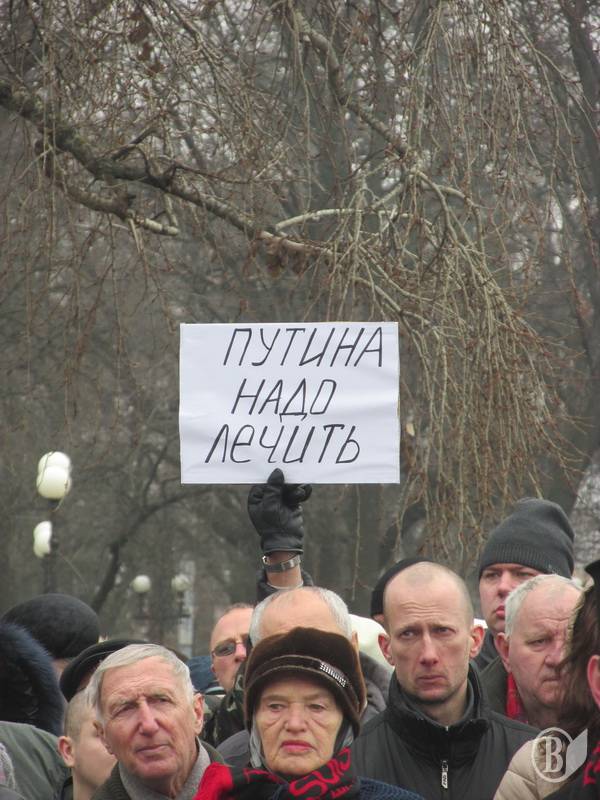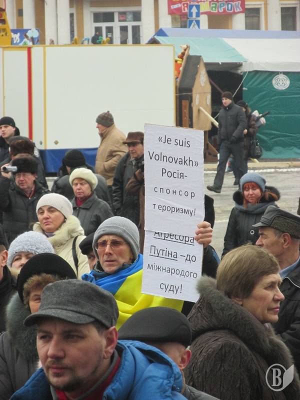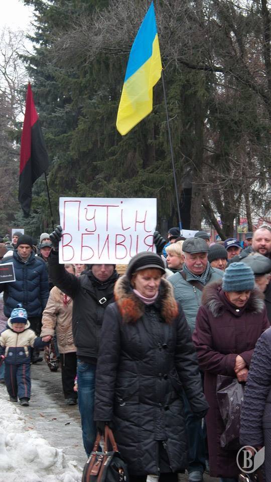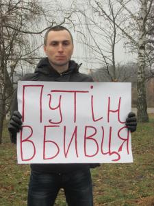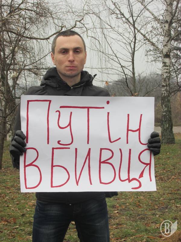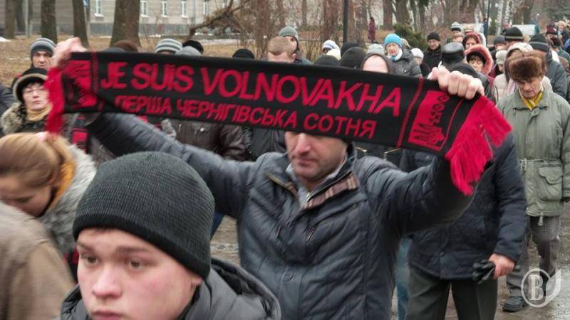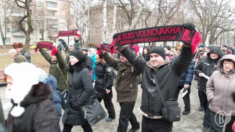 Черниговцы вышли с плакатами «Путин-убийца», «Я – Воловаха» на украинском и французском языках"Россия - спонсор терроризма","Агрессора Путина - в международный суд", Путин -спонсор терроризма!".