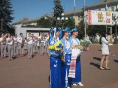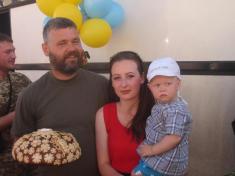 Дівчата в українських строях вручили коровай, що його прийняв кулеметник, заступник голови обласного товариства "Просвіта" імені Т.Шевченка Олександр Шевченко. Його зустрічали дружина з сином Льонею, мати та брат Дмитро.