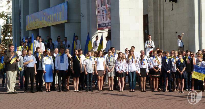 Чернігів на центральній Красній площі біля обласного академічного українського музично-драматичний театру імені Шевченка відзначає день Державного Прапора України.