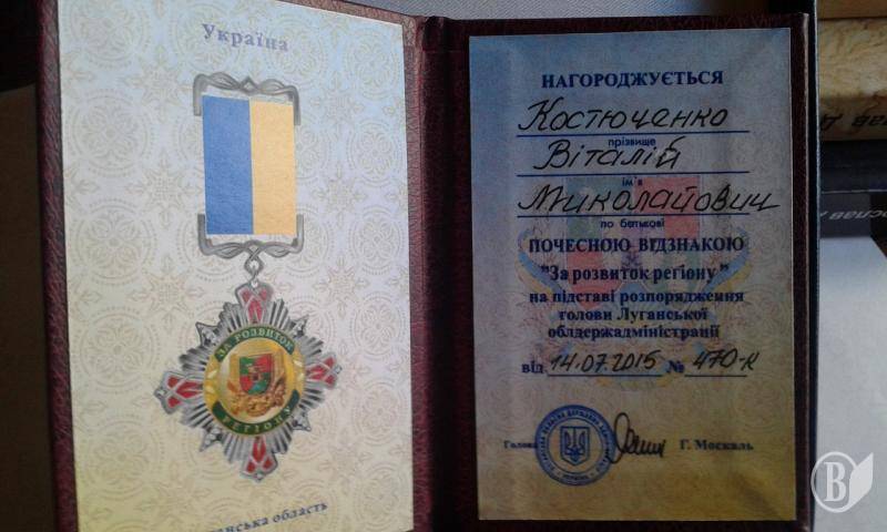 Почесною відзнакою «За розвиток регіону» на підставі розпорядження голови Луганської облдержадміністрації від 14.07.2015 року Геннадія Москаля було сьогодні нагороджено заступника командира спецбатальйону УМВС «Чернігів», учасника «Самооборони Майдану» Віталія Костюченка та в минулому, начальника штабу батальйону «Чернігів», полковника Сергія Любенка.