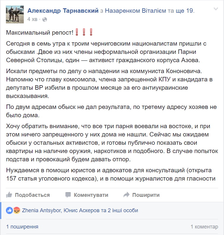 Сьогодні о сьомій ранку до трьох чернігівських націоналістів прийшли з обшуками. Двоє з них члени неформальної організації Хлопці Північної Столиці, один - активіст громадянського корпусу Азова.