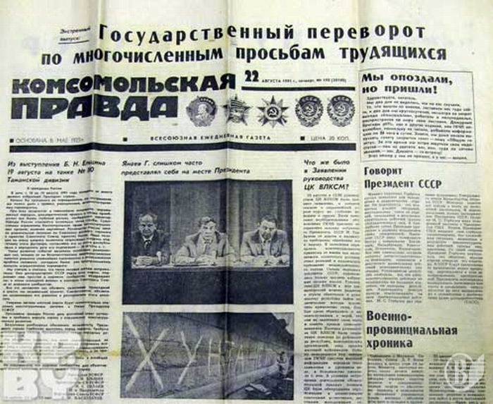 В 6 утра 19 августа 1991-го теле- и радиоканалы передали обращение к народу прокоммунистического ГКЧП во главе с вице-президентом Геннадием Янаевым, объявив о введении чрезвычайного состояния и переизбрании на себя обязанностей главы государства. Таким образом консервативное крыло ЦК КПСС пыталось остановить демократические преобразования в государстве и сохранить СССР, поскольку на то время Декларации о государственном суверенитете уже постановили Литва, Латвия, Эстония, Грузия, Армения, Молдова, Украина.