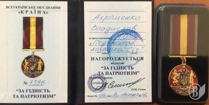 «Узнагародзілі ўкраінскім медалём, – повідомив Владислав Ахроменко у Facebook. – Не чакаў. Дякую, друзі!».