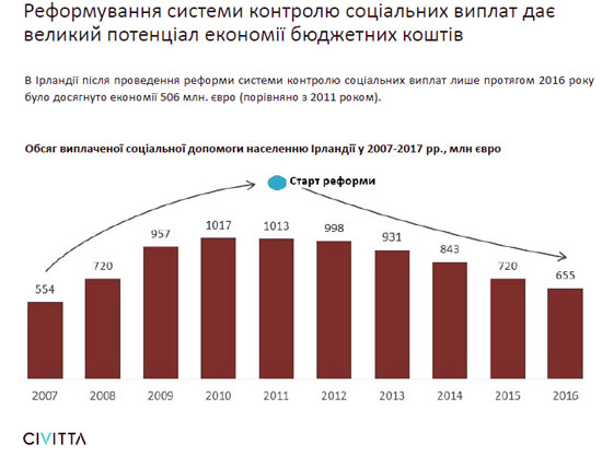 Запропоновані урядом Ірландії заходи були спрямовані на боротьбу з шахрайством і помилками у сфері соціальних виплат. Спеціальний слідчий відділ зосередився на тіньовій економіці та галузях, де найчастіше поширюється соціальне шахрайство. У рамках першого етапу реформи у 2011 – 2013 р.р. було виявлене неефективне використання коштів соціальної підтримки загальним обсягом 1,9 млрд. євро, а лише протягом 2016 року - на суму 506 млн. євро.