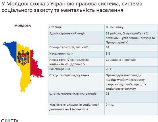 Реформування механізмів контролю за наданням соціальної підтримки розпочато і в сусідній Молдові. З 2011 року там було запроваджено Соціальну інспекцію як окремий орган, що має здійснювати контроль у даній сфері. А з2014-го року були розроблені і впроваджені сучасні механізми і методики контролю - «профілі ризику» одержувача соціальної допомоги, критерії ризику для надання соціальної допомоги тощо. Також впроваджена програма, яка на підставі даних обирала з інформаційної системи заяви, що знаходяться в зоні ризику.