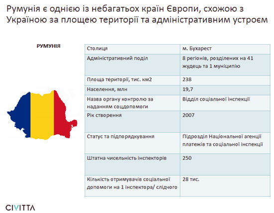 У Румунії створено і успішно функціонує Національне агентство з виплат та соціальної інспекції з регіональними відділеннями, підпорядковане Міністерству праці, сім’ї, соціального захисту людей похилого віку. Соціальна інспекція в Румунії має великі права та здійснює, окрім виплат, широкомасштабний контроль якості соціальних послуг, що надаються як державними, так і приватними установами, та повідомляє компетентним органам інформаціюпро виявлені правопорушення.