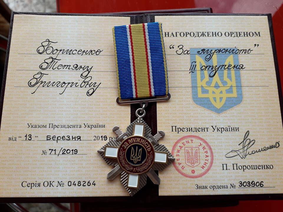 «Указом Президента України за особисту мужність, виявлену у захисті державного суверенітету та територіальної цілісності України, самовіддане служіння Українському народу нагороджено орденом «За мужність» ІІІ ступеня Борисенко Тетяну Григорівну, солдата запасу.»