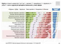 Крім цього, у топ-5 потрапили програма «Держава в смартфоні» (40% позитивних оцінок), звільнення полонених і заручників (38%), зміцнення обороноздатності країни та міжнародна політика — по 30%.
