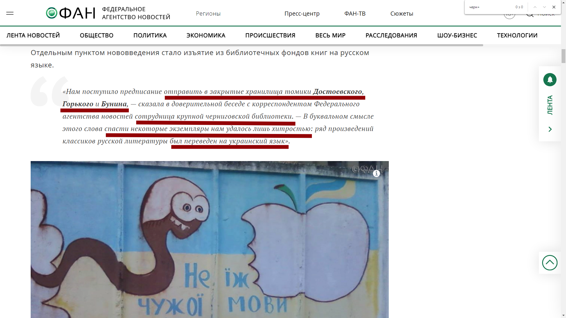 «Нам поступило предписание отправить в закрытые хранилища томики Достоевского, Горького и Бунина, — сказала в доверительной беседе с корреспондентом Федерального агентства новостей сотрудница крупной черниговской библиотеки. — В буквальном смысле этого слова спасти некоторые экземпляры нам удалось лишь хитростью: ряд произведений классиков русской литературы был переведен на украинский язык»".