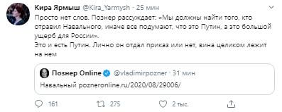 "Просто немає слів. Познер міркує: "Ми повинні знайти того, хто отруїв Навального, інакше всі подумають, що це Путін, а це великий збиток для Росії". Це і є Путін. Особисто він віддав наказ чи ні, вина повністю лежить на ньому", - заявила Ярмиш