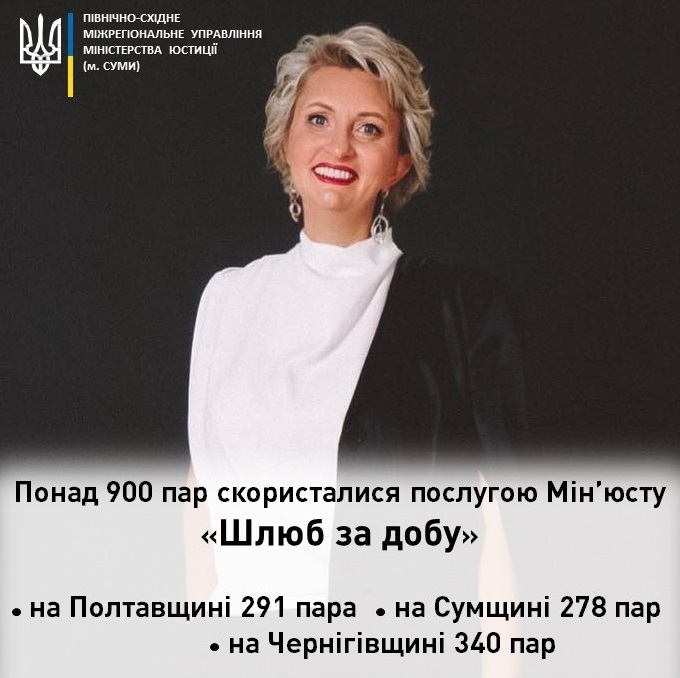 "Зараз для молодят окрім класичного одруження також доступна послуга «Шлюб за добу». Вона суттєво зменшує термін очікування весільної церемонії, дозволяючи закоханим вже на наступний день, після подачі заяви, стати чоловіком та дружиною. Найбільше сервіс від Мін’юсту вподобали на Чернігівщині, де з початку року зареєстрували 340 родин, на Полтавщині – 291 та 278 одружень на Сумщині», – зазначила Ірина Свистун, начальник Північно-Східного міжрегіонального управління Міністерства юстиції (м. Суми).