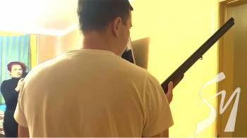 На інших кадрах, знятих у кімнаті, видно чоловіка з мисливською рушницею, а також жінку, яка знімає те, що відбувається, на мобільний телефон. Хто зняв це відео - невідомо.