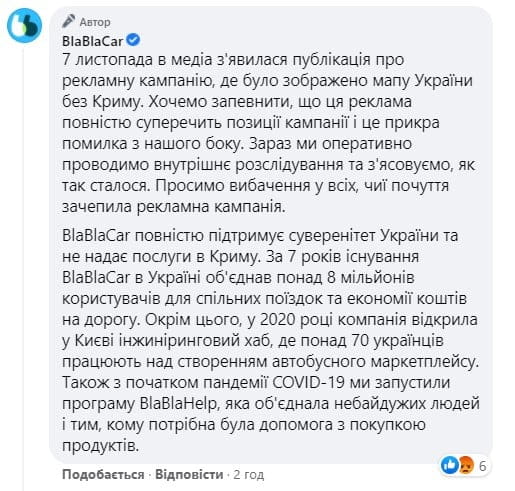 Крім того, вочевидь на активність користувачів соцмережі, під останнім дописом у офіційній групі на Facebook з'явився такий коментар: "7 листопада в медіа з'явилася публікація про рекламну кампанію, де було зображено мапу України без Криму. Хочемо запевнити, що ця реклама повністю суперечить позиції кампанії і це прикра помилка з нашого боку. Зараз ми оперативно проводимо внутрішнє розслідування та з'ясовуємо, як так сталося. Просимо вибачення у всіх, чиї почуття зачепила рекламна кампанія. BlaBlaCar повністю підтримує суверенітет України та не надає послуги в Криму".