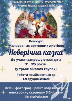 Чернігівська міська ЦБС запрошує дітей 7 - 15 років взяти участь у конкурсі святкових мальованих листівок "Новорічна казка".