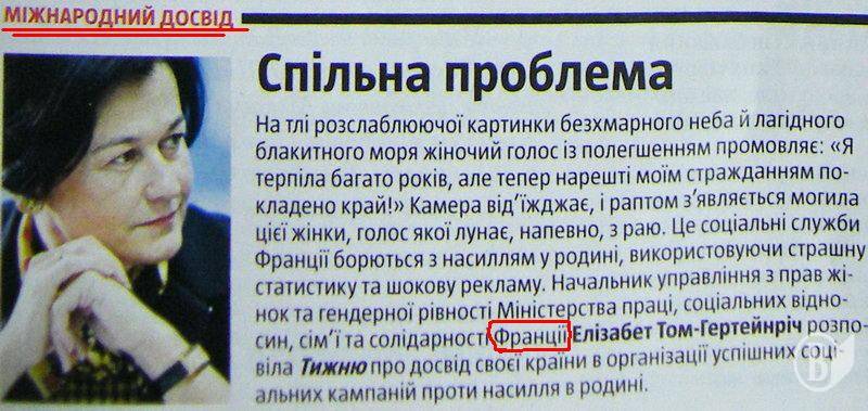 За неписаними правилами реклами після нагнітання страху перед так званим «сімейним насильством» тут же подається вирішення проблеми під рубрикою «міжнародний досвід». В якості останнього – думка жінки-чиновника французького міністерства, яка опікується питаннями сім’ї і так званої «гендерної рівності».