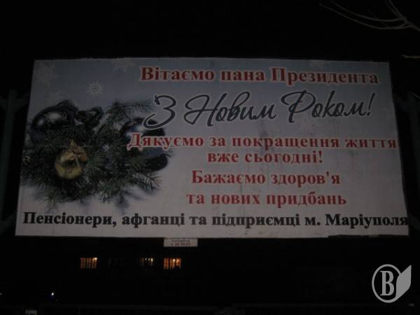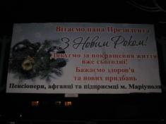 А ось люди не забули. У Маріуполі невідомі встановили білборд, на якому привітали Віктора Януковича з Новим роком, подякували за покращення життя вже сьогодні і побажали Президенту «нових придбаннь».
