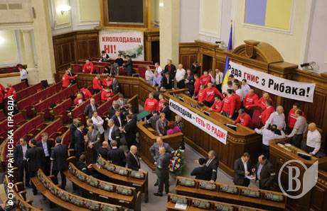 На трибуні розміщено плакати "Рада гниє з Рибака" і "Кнопкодави – геть із Ради".