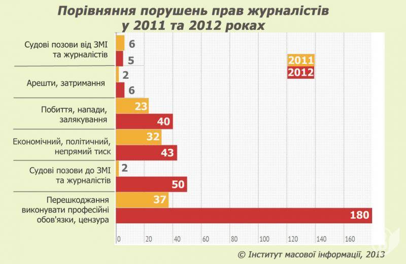 Загалом експерти ІМІ в 2012 році зафіксували 324 випадки порушень прав журналістів, із них: порушень, арештів, затримань — 6; побиття, нападів, залякувань — 40; перешкоджань виконувати професійні обов’язки, цензура — 180; економічного, політичного, непрямого тиску — 43; судових позовів до ЗМІ та журналістів — 50; судових позовів від ЗМІ та журналістів — 5.