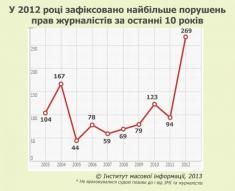 В Україні 2012 рік став рекордним за кількістю порушень прав журналістів — 324 випадки. Це найбільша кількість зафіксованих порушень за останні 10 років.