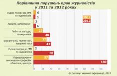 Варто відзначити, що у 2012 році було порушено 6 кримінальних справ за ст. 171 Кримінального кодексу України (перешкоджання законній професійній діяльності журналістів), що є рекордним числом за всі роки незалежності. На жаль, покарання несе, в середньому, лише кожен 20-й порушник прав журналістів.