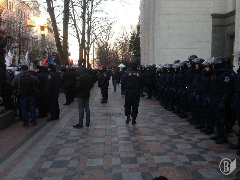 Вход для прессы от утра охраняет свыше 100 бойцов беркута. В настоящий момент за их спинами прячутся «титушки».