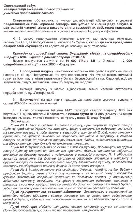 "Я вирішив оприлюднити частину планів "Хвиля" та "Бумеранг" — документи, які доводять, що снайперами на вул.Інститутській були бійці підрозділу спеціальних операцій внутрішніх військ, яким керує полковник С.Асавалюк, та бійці підрозділу внутрішніх військ "Омега"", - повідомив Москаль.