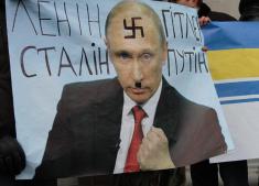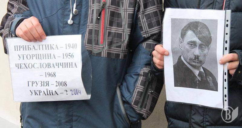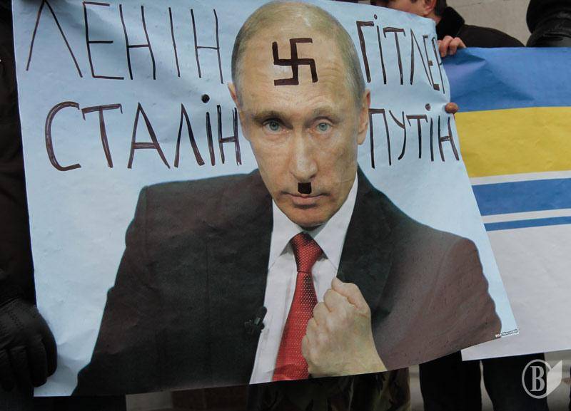 Путін був представлений у військовій есесівській формі. На інших портретах - йому були примальовані характерні вуса-щіточка, як у диктора.