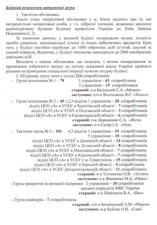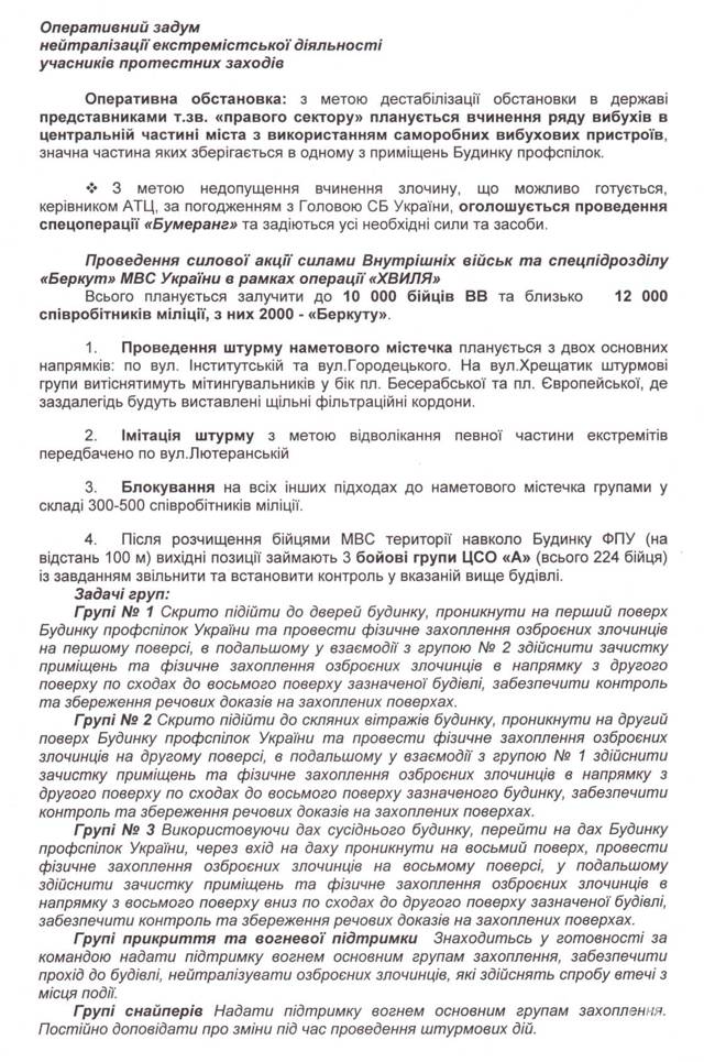 З огляду на це я вирішив оприлюднити частину планів “Хвиля” та “Бумеранг” — документи, які доводять, що снайперами на вул.Інститутській були бійці підрозділу спеціальних операцій внутрішніх військ, яким керує полковник С.Асавалюк, та бійці підрозділу внутрішніх військ “Омега”.