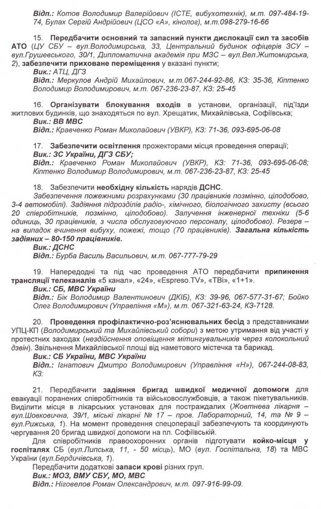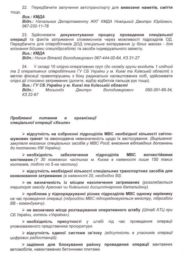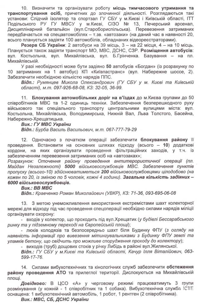 Крім того, вказівку на застосування зброї колишній міністр МВС В.Захарченко дав спецпідрозділу ГУБОЗ МВС “Сокіл”. Надаю прізвища та номери телефонів керівників підрозділів, що брали участь у силовому розгоні акцій протесу. На підставі цих даних Генпрокуратура має відкрити кримінальні провадження.