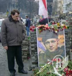 На вулиці Грушевського, біля барикад поруч зі стадіоном «Динамо», була особливо хвилююча зупинка. Адже саме тут загинув білорус, земляк наших гостей Михайло Жизнєвський, родом з Гомельщини. На вулиці, де він загинув, встановлено імпровізований пам`ятник Михайлові, його великий пертрет, над ним білоруський національний біло-червоно-білий прапор, поруч живі квіти, горять свічки. Гості вклонилится своєму землякові, який став одним з перших загиблих у нашу революцію.