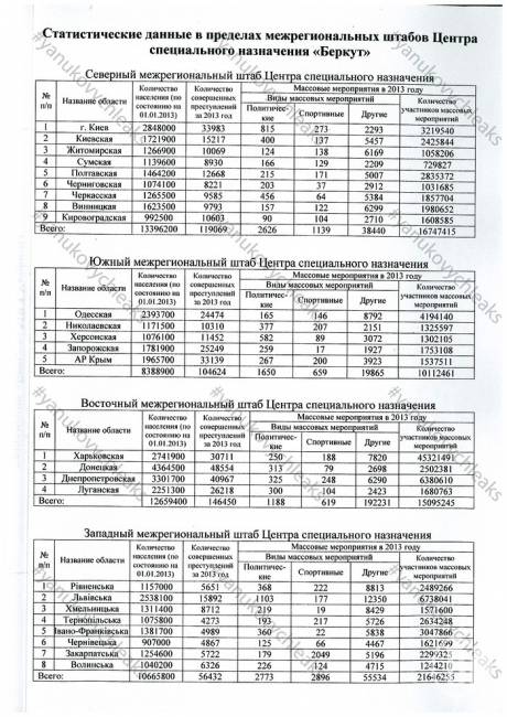 У документі під назвою "Статистичні дані в межах межрегіональних штабів Центра спеціального призначення "Беркут" наведено дані про кількість вчинених злочинів за 2013 рік.