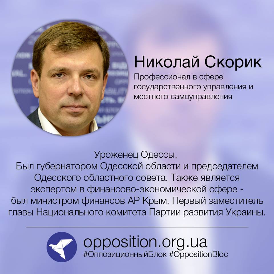 № 10. Скорик Микола. Народився у місті Одеса, професіонал у галузі державного управління та місцевого самоврядування — працював головою Одеської обласної державної адміністрації та головою Одеської обласної ради. Також є експертом у фінансово-економічній сфері — працював міністром фінансів Автономної Республіки Крим. Перший заступник голови Національного комітету Партії розвитку України.