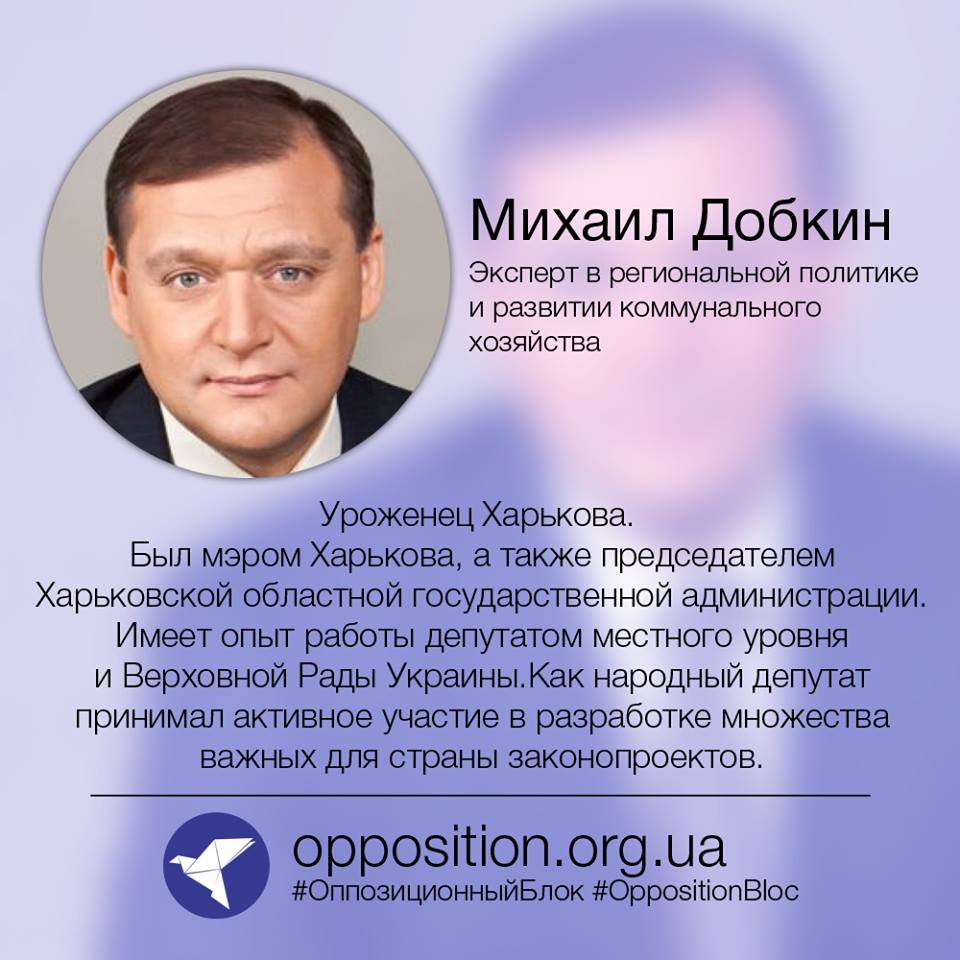 № 3. Добкін Михайло. Народився у Харкові. Експерт з регіональної політики та розвитку комунального господарства. Працював мером Харкова та головою Харківської обласної державної адміністрації. Має досвід роботи депутатом місцевого рівня та Верховної Ради України. Брав активну участь у розробці десятків законопроектів.