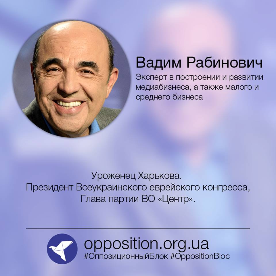 № 4. Рабинович Вадим. Народився у Харкові. Експерт у розвитку медіабізнесу, а також малого та середнього бізнесу. Президент Всеукраїнського єврейського конгресу, очільник партії ВО «Центр».