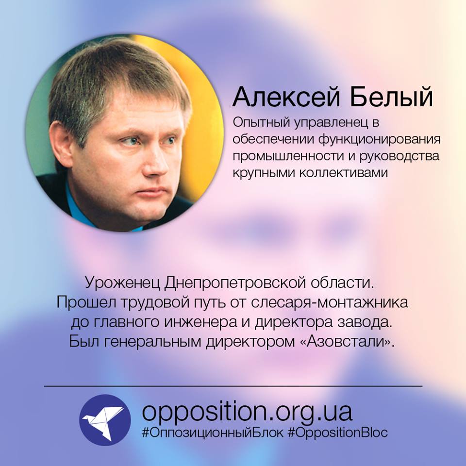 № 5. Білий Олексій. Народився у Дніпропетровській області, пройшов трудовий шлях від слюсаря-монтажника до головного інженера та директора заводу. Досвідчений управлінець у галузі забезпечення функціонування промисловості та управління великими колективами — працював генеральним директором «Азовсталі».