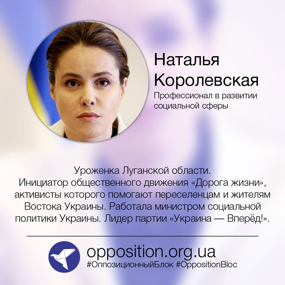 № 8. Королевська Наталія. Народилась у Луганській області, ініціатор громадського руху «Дорога життя», активісти якого допомагають переселенцям та жителям Сходу України. Професіонал у галузі соціальної сфери — працювала міністром соціальної політики України. Лідер партії «Україна — Вперед!».